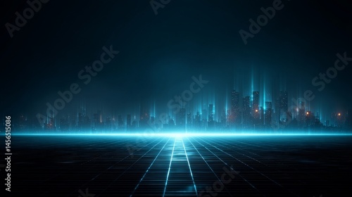 Futuristic neon blue lines glow in an abstract technological setting, stock image available
