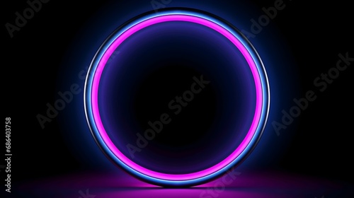 Futuristic neon circle glowing with vibrant pink and blue colors on a dark background, abstract technology concept.