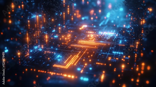 Futuristic Neon Circuit Board Background Glowing with Blue and Orange Lights
