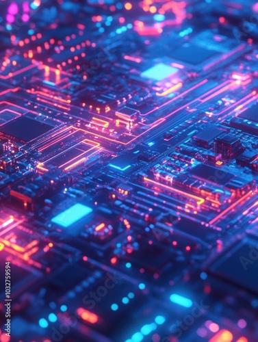 Futuristic Neon Circuit Board with Glowing Data Pathways, Advanced Electronics and AI Technology