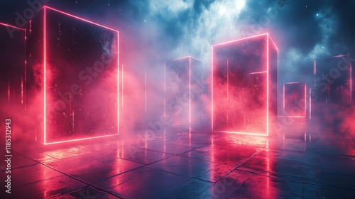 Futuristic Neon Cyberpunk Landscape with Glowing Geometric Shapes and Soft Lighting