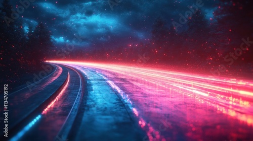 Futuristic Neon Digital Landscape Abstract Technology Background with Geometric Shapes Light Trails and Cyberpunk Style