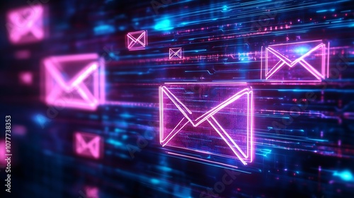 Futuristic Neon Email Icons on a High-Tech Digital Background for Innovative Communication : Generative AI