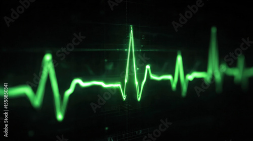 Futuristic neon green heartbeat line moving across dark digital screen, seamless electrocardiogram graph animation style, glowing pulse peaks with data overlays, modern medical tech background