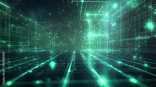 Futuristic Neon Grids - Abstract 3D Render with Digital Patterns in Green and Blue Hues