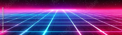 Futuristic neon landscape with glowing grid and starry sky, ideal for tech and gaming backgrounds
