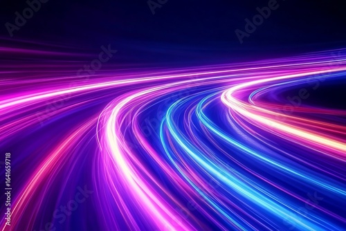 Futuristic neon light trails in vibrant colors creating dynamic motion and speed on a dark background