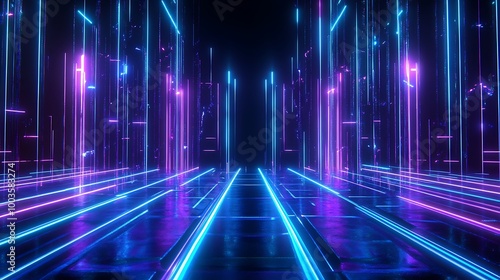 Futuristic neon lights creating a vibrant corridor effect, glowing brilliantly in various shades of pink and blue.