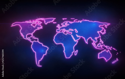 Futuristic Neon Map: A sleek digital world map with glowing neon blue and magenta global network connections, symbolizing data transfer and advanced connectivity.