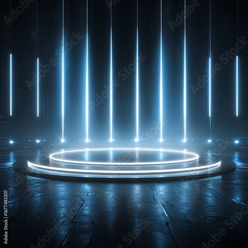 Futuristic Neon Stage Lighting Display with Illuminated Platform and Light Beams