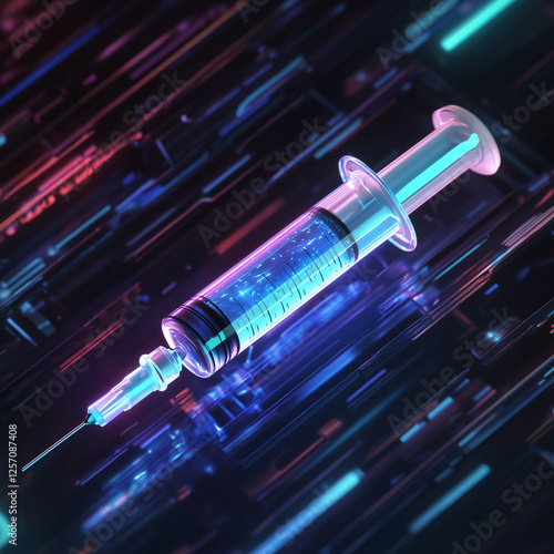 Futuristic Neon-Glowing Syringe with Digital Particles on Abstract Tech Background – Cyberpunk Medical Innovation, Biotechnology and Sci-Fi Medicine