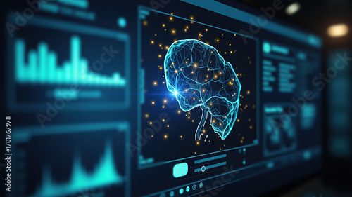 Futuristic neural network interface displaying brain data visualization. AI Diagnostics.
