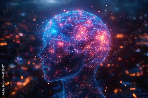futuristic neural network projected onto a translucent human brain glowing with vibrant blue and purple hues against a dark background intricate circuitry patterns