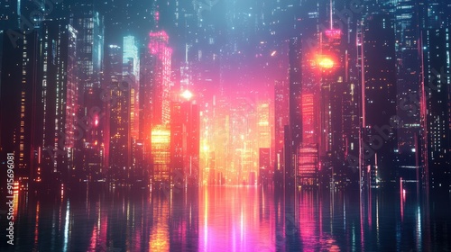 Futuristic night city with a colorful background and glowing neon lights. Wide-angle cityscape view with cyberpunk and retro wave influences.