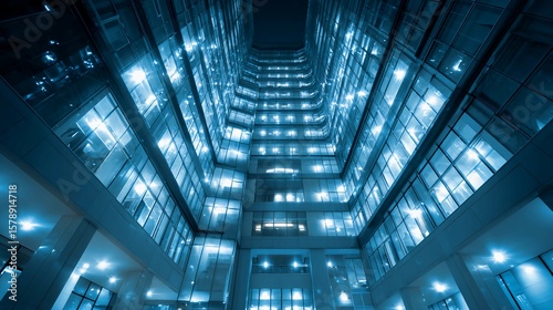 Futuristic office building photography with bright lighting, high-end photography, used in some tech backgrounds, blue tone.