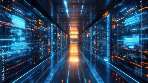 Futuristic office complex with holographic walls and dynamic patterns, transparent elevators with an unobstructed floating view between floors in an advanced urban development.
