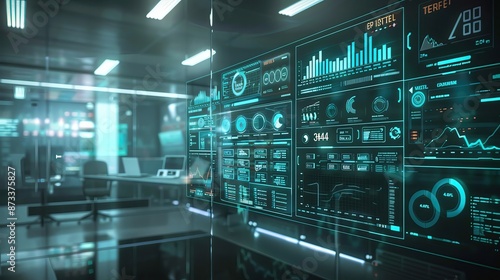 Futuristic office with advanced technology and holographic displays, showcasing innovation and modern workspace design.