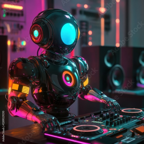 Futuristic party scene with a colorful AI dj robot and music speakers
