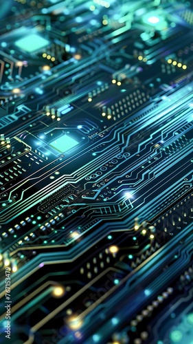 Futuristic PCB design with glowing microchips ideal for high tech backgrounds