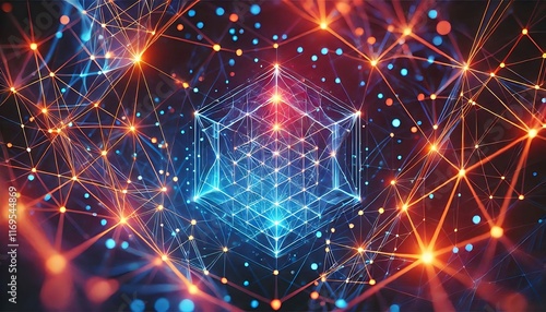 Futuristic polygonal grids with glowing points connecting in vibrant geometric structures designed using generative AI for banners.