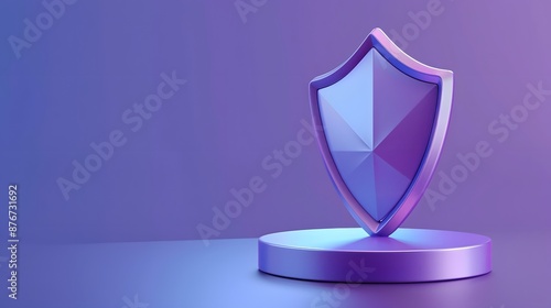 Futuristic polygonal shield symbolizing security and protection displayed on a platform with a modern purple background.