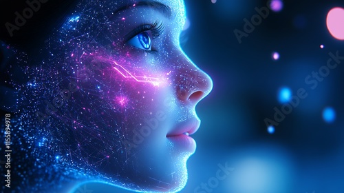 Futuristic Profile Portrait with Digital Neon Face Elements : Generative AI