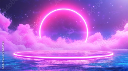 Futuristic quantum computing concept with neon frame and data visualization in dreamy landscape scene