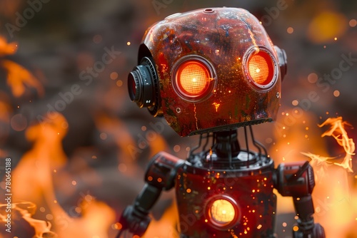 Futuristic Red Robot with Glowing Eyes Standing Among Flames Concept Art for Science Fiction and Technology