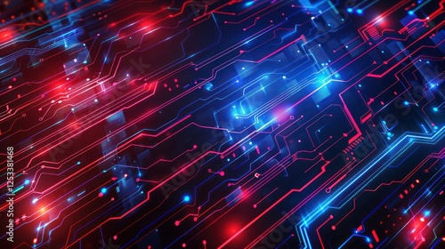 Futuristic red-blue circuit board data flow, digital background, tech design