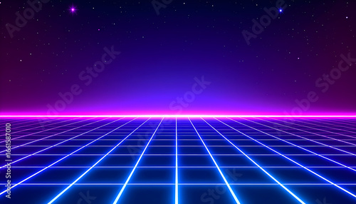 Futuristic retrowave background with glowing neon grid of blue and purple light. synthwave style creates cool, nostalgic and retro feeling for digital landscape