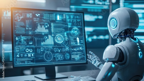 Futuristic Robot Analyzing Data on a High-Tech Computer Screen