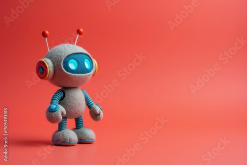 Futuristic robot Craft from felt on red background. A toy for a child. Material for creativity. AI
