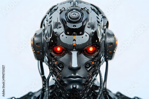futuristic robot cyborg with angry red eyes, artificial intelligence