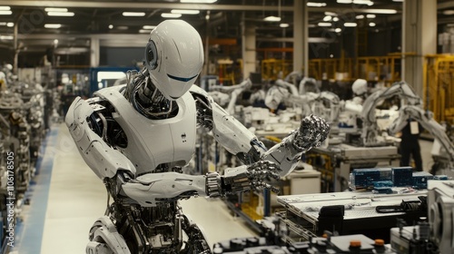 Futuristic Robot in High-Tech Factory: Automation and AI in Modern Manufacturing