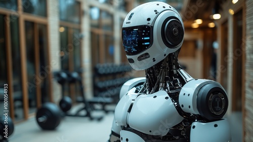 Futuristic Robot in Modern Gym Surrounded by Exercise Equipment