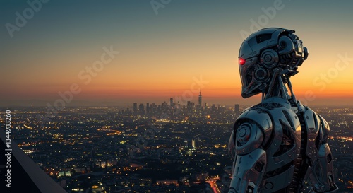 Futuristic robot overlooking city skyline at dusk