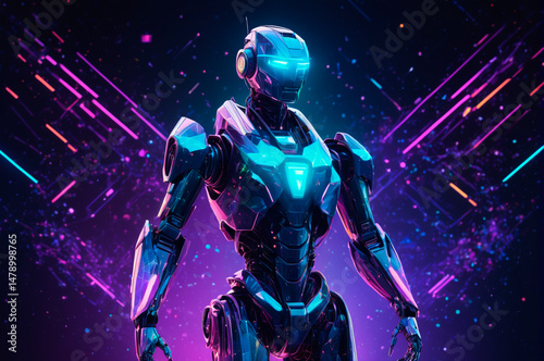 Futuristic Robot Standing in Neon Sci-Fi Environment. Generative, ai,