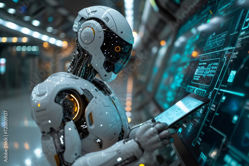 Futuristic Robot Using Tablet in High-Tech Environment. A robot with advanced technology uses a tablet in a futuristic setting.