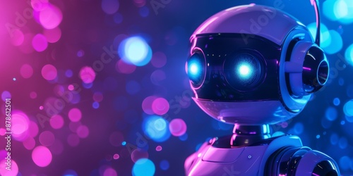 Futuristic robot with glowing blue eyes in a neon-lit, bokeh background, representing advanced AI technology.