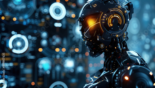 Futuristic Robot with Glowing Eyes Interacting with Digital Data Streams in High-Tech Setting, Symbolizing Advanced AI Technology and Machine Learning Innovation