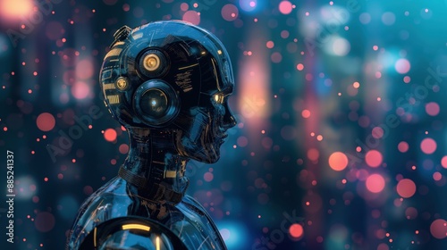 Futuristic robot with illuminated circuits, standing against a vibrant bokeh background
