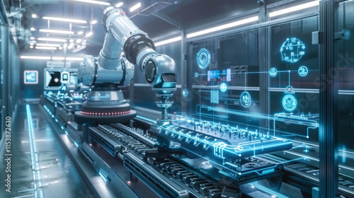Futuristic Robotic Arm Assembling Electronics in High-Tech Factory.