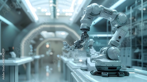 Futuristic robotic arm with gleaming metal components dexterously engaged in delicate tasks,set against the backdrop of a sleek,minimalist high-tech laboratory environment.