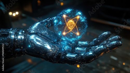 Futuristic robotic hand holding glowing atomic sphere in dark sci-fi setting