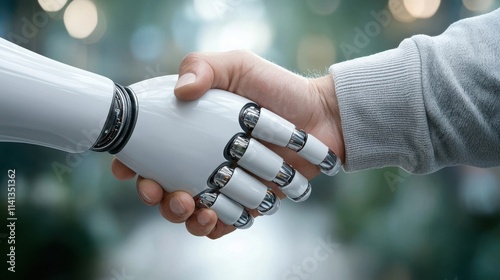 Futuristic robotic handshake between two metallic robotic arms representing the of advanced intelligence and digital innovation in modern corporate partnerships mergers and joint ventures