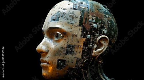 Futuristic Robotic Head Profile Digital Art Advanced Technology Circuitry Mechanical Humanoid Artificial Intelligence Golden Brown Hues Detailed 3D