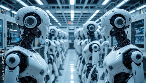 Futuristic robots engaging in assembly line operations high-tech factory digital art industrial environment close-up viewpoint automation and ai revolution