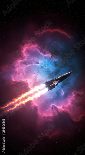 Futuristic rocket spaceship traveling through colorful nebula with fiery trail
