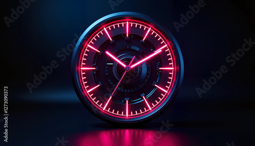 Futuristic round clock with glowing neon dial, suspended against a dark background, featuring a sleek digital display in a sci-fi aesthetic