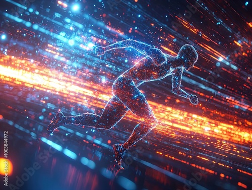 Futuristic Running Figure Poster: A Stunning Visual of Glowing Geometric Shapes Racing Through a Digital Universe, Perfect for Sports Decor and Inspiring Athletic Spaces